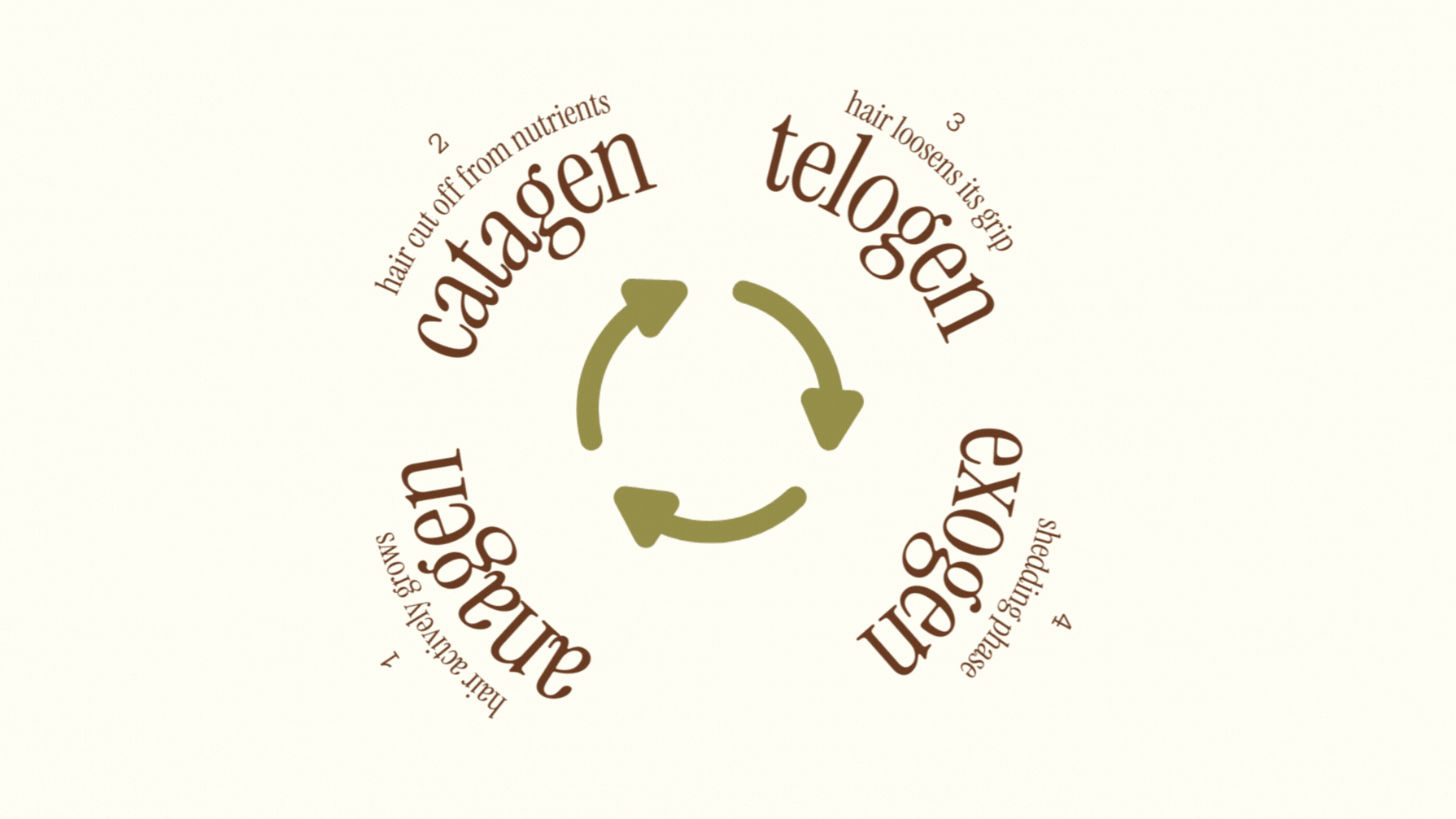 A short transitional stage where growth slows and the hair follicle begins to shrink. The strand detaches from its blood supply, preparing to rest. Only a small percentage of hairs are in this phase at once, 3%ish.